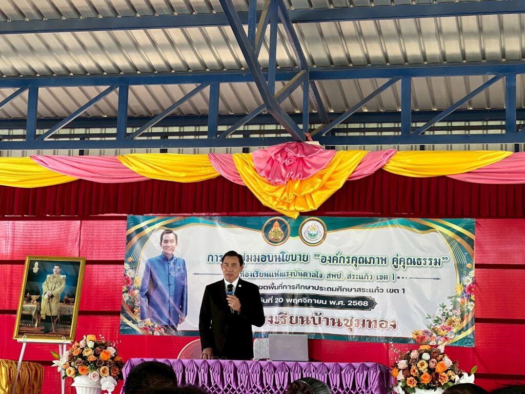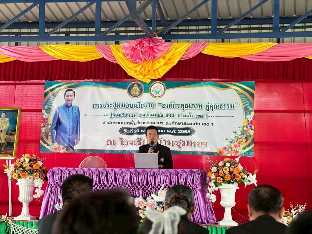 นางจิรภา ธีระวิทย์ ผู้อำนวยการโรงเรียนบ้านเขาตาง้อก พร้อมด้วยคณะครูโรงเรียนบ้านเขาตาง้อก ประชุมมอบนโยบาย “องค์กรคุณภาพ คู่คุณธรรม สู่ห้องเรียนแห่งแรงบันดาลใจ สพป.สระแก้ว เขต 1” โดยมี นายอุทัย คำสีหา ผู้อำนวยการสำนักงานเขตพื้นที่การศึกษาประถมศึกษาสระแก้ว เขต 1 เป็นประธานการประชุมมอบนโยบาย พร้อมด้วย นางพรพนา บัวอินทร์ ว่าที่ร้อยตรีสุขสันต์ จวงพลงาม นายพัฒนศักดิ์ เปลี่ยนรัมย์ รองผู้อำนวยการสำนักงานเขตพื้นที่การศึกษาประถมศึกษาสระแก้ว เขต 1 โดยมีนายคุณาพัฒน์ เวทย์มนต์ ประธานศูนย์เครือข่ายระดับอำเภอคลองหาด เป็นผู้กล่าวรายงาน พร้อมด้วยข้าราชการครูและบุคลากรทางการศึกษาอำเภอคลองหาด เข้าร่วมรับฟังการบรรยาย ณ อาคารโดมโรงเรียนบ้านชุมทอง อ.คลองหาด จ.สระแก้ว